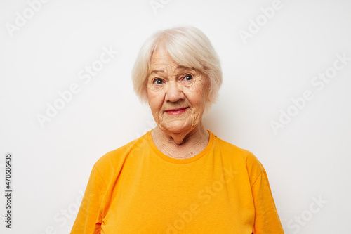 smiling elderly woman in casual t-shirt gestures with his hands isolated background