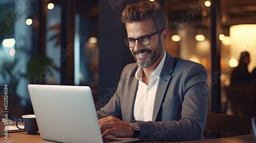 Smiling elegant business man sitting at desk working on laptop in the office