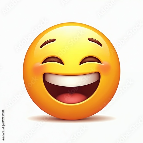Smiling emoji face with cheerful expression on white background. Happy emoticon, positive mood, joyful feeling, good emotions. Modern design, social media, digital communication, online chat, fun.