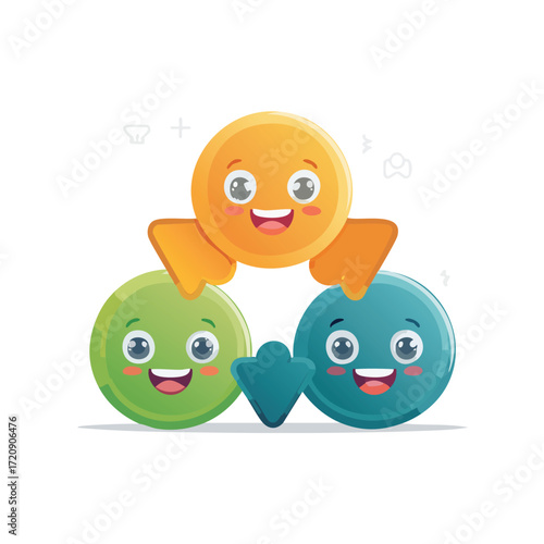 Smiling Emoticons in a Triangular Formation Representing Teamwork and Collaboration, with Arrows Showing Interconnection