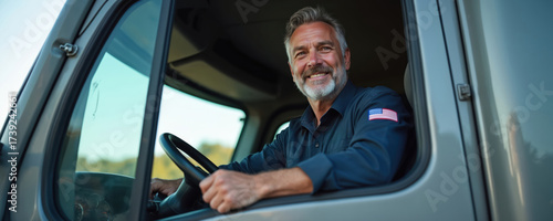 Smiling experienced man drives semi truck. Mature driver with grey hair and moustache wears uniform with american flag patch. He sits in cabin at steering wheel looking out windscreen.