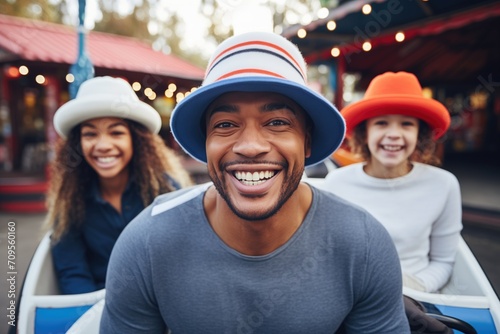 smiling family wearing matching hats on bumper cars