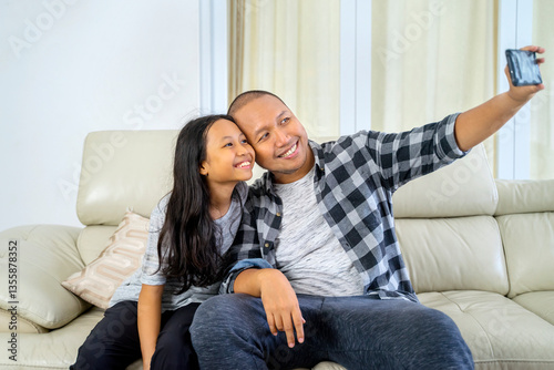 Smiling father and daughter taking a selfie together on the couch, capturing happy family moments at home.