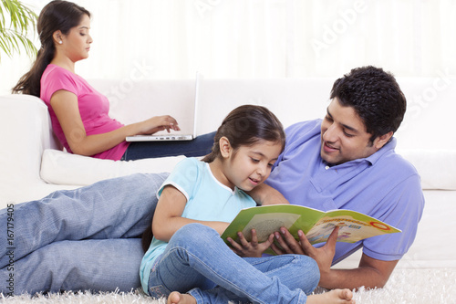 Smiling father helping child in homework with woman using laptop in the background