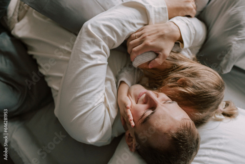 Smiling father hugging daughter in bed at home