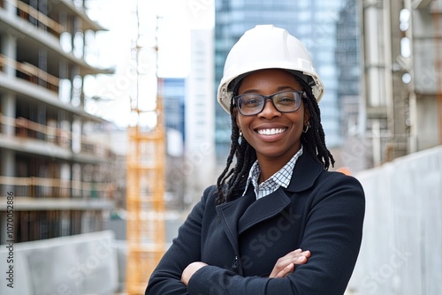 Smiling female construction worker in hard hat stands confidently at urban construction site during daylight hours. Generative AI