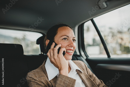 Smiling female entrepreneur talking on phone while traveling in taxi