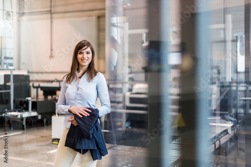 Smiling female professional holding blazer while standing in factory