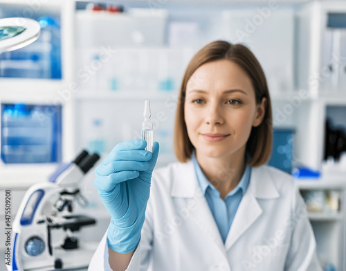 Smiling female scientist in lab coat and gloves holding glass ampoule in laboratory. Scientific research, innovation, and medical development concept.