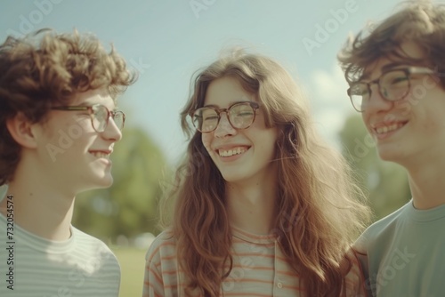 Smiling friends revel in the joy of togetherness. Happy group celebrates in style, background vibrant.