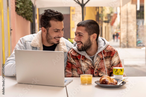 smiling gay couple at cafe using laptop