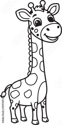 Smiling giraffe cartoon character standing tall, simple spots, black and white for kids coloring pages