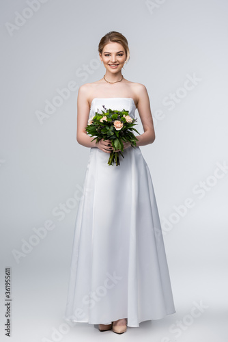 smiling girl in white wedding dress holding bouquet of flowers on grey