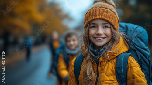 Smiling Girl on Autumn Hike: A young girl with a bright smile and a backpack, leading the way on an autumn hike, her cheerful expression captures the joy of exploration and the beauty of nature.