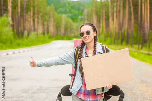Smiling girl travels hitchhiking with a cardboard sign in her hands. Space for text