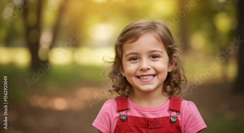 Smiling girl with curly hair in pink shirt and red overalls outdoors. Happy child portrait for elementary education and outdoor learning programs