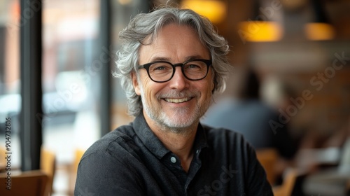 Smiling Grey-Haired Man in Glasses Relaxing in a Bright Café or Workspace, Exuding a Friendly and Approachable Vibe