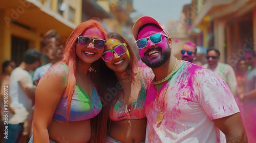 Smiling group of friends in Udaipur covered in colorful Holi powder, celebrating with laughter and vibrant colors, embodying the joy of the festival