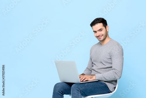 Smiling handsome man sitting typing on laptop computer in isolated studio light blue background