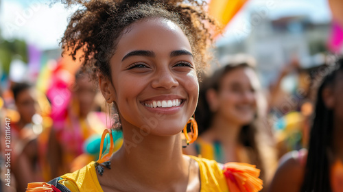 Smiling happy woman on colorful parade celebrates women's empowerment with vibrant displays and joyful participants in a lively urban setting