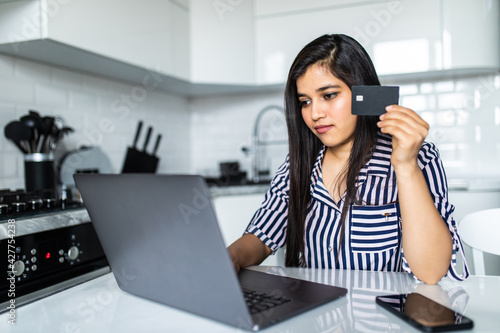 Smiling indian woman online shopping using laptop and credit card in kitchen