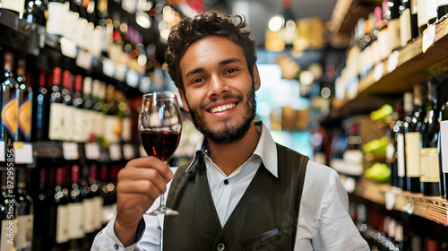 Smiling Italian salesman showcasing premium red wine glass among wine bottles in luxury wine store. Customer service and small business concept.