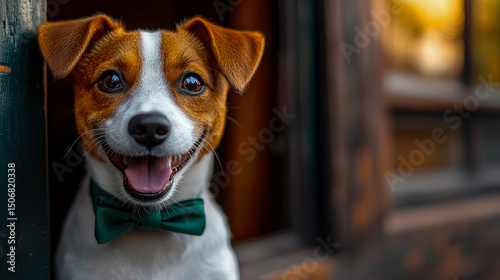 Smiling Jack Russell Terrier Portrait with Green Bowtie