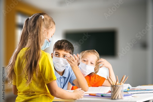 Smiling junior happy school student sittistng in classroom