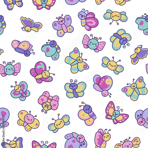 Smiling kawaii butterfly. Seamless pattern. Cute cartoon funny insects. Hand drawn style. Vector drawing. Design ornaments.