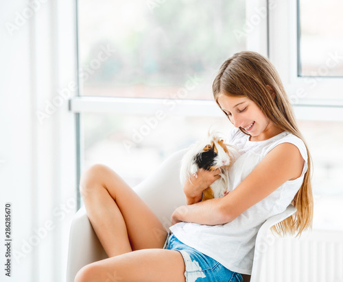 Smiling kid girl holding cute guinea pig