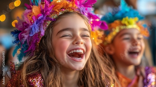 Smiling Kids Wearing Colorful Feathers at Carnival Parade. Generative AI