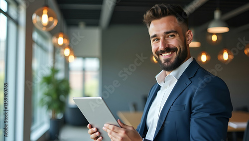 Smiling Latin Male Project Manager in Office Using Tablet - Professional Portrait with Space