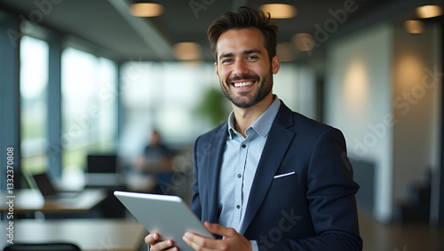 Smiling Latin Male Project Manager in Office Using Tablet - Stock Photo