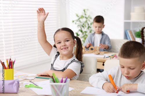 Smiling little girl raising hand at wooden desk during art lesson in elementary school