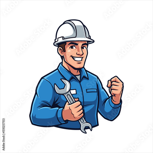 Smiling Male Mechanic in Blue Uniform Holding Wrench