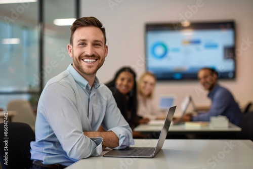 Smiling male professional with laptop, team working behind, TV showing presentation. Natural light and neutral background, ideal for copy or product display in a collaborative office.