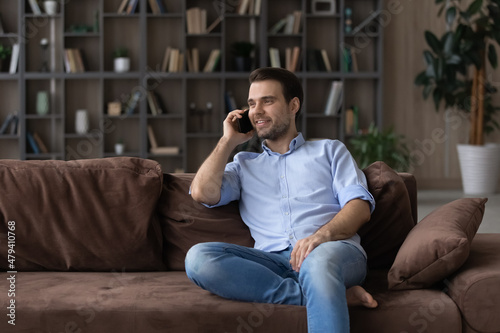 Smiling man chatting by phone call, relaxing on comfortable couch in modern living room, happy young male speaking, enjoying pleasant conversation with friend or girlfriend by smartphone at home