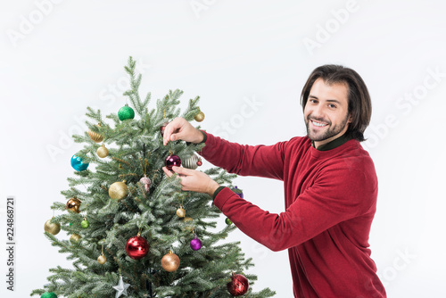 smiling man decorating christmas tree with glass balls and looking at camera isolated on white