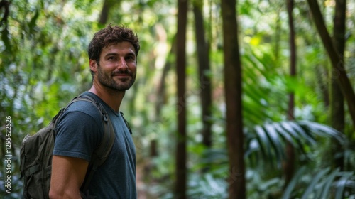 Smiling Man Hiking in Lush Green Tropical Jungle