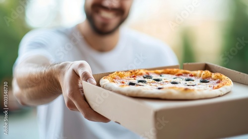 Smiling Man Holding Freshly Baked Pizza in Takeout Box Outdoors