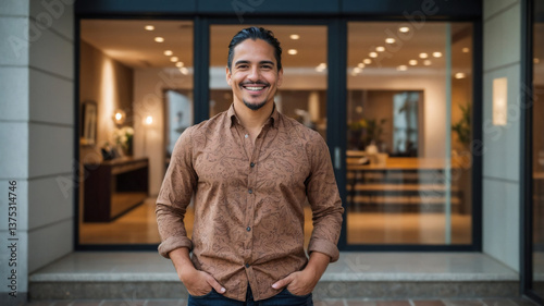 Smiling man in a brown patterned shirt standing in front of glass doors of an office building. He is confident and approachable.