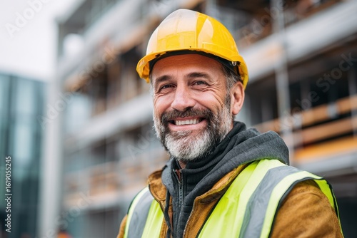 Smiling man in a hard hat and reflective vest posing for the camera architect or engineer