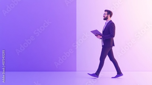 Smiling Man in a Suit Walking in a Purple and White Room