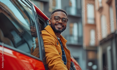 Smiling Man in a Yellow Jacket Leaning out of a Red Vehicle on a City Street