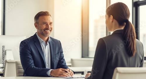 Smiling Man in Blue Suit Interviewing Woman in Office Sunlight