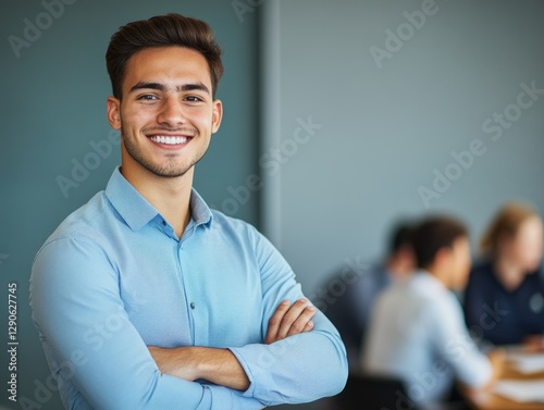 Smiling man in business attire, confidently posing for a corporate image in an office boardroom with colleagues. Professional workwear and modern setting.