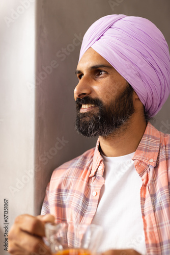 Smiling man in turban holding cup of tea, enjoying peaceful moment at home