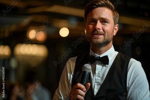 Smiling Man in Vest and Bowtie at Microphone in Indoor Setting