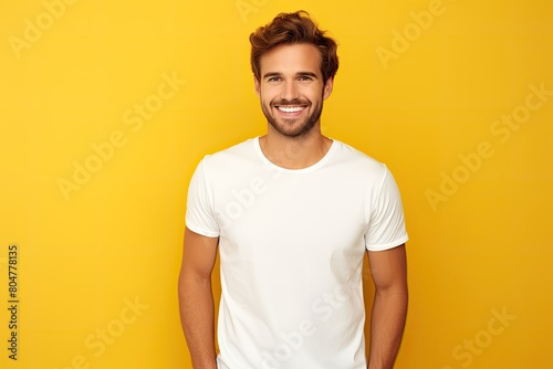 smiling man in white t-shirt against yellow background
