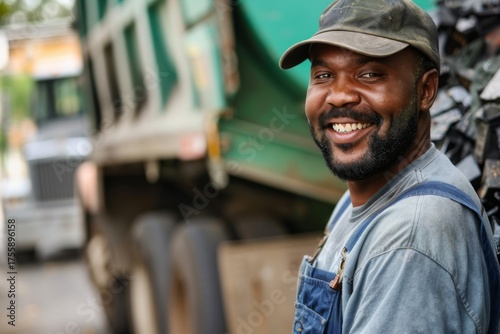 Smiling man in work attire near garbage truck